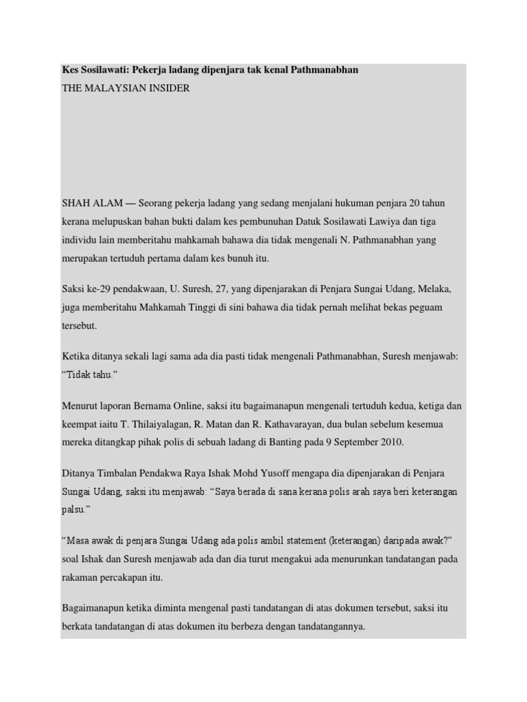 Pathmanabhan dan tiga pekerja ladang T Thilaiyalagan R Matan dan R Khatavarayan didakwa membunuh Sosilawati 47. Dua peguam yang pernah bekerja dengan N Pathmanabhan memberitahu Mahkamah Tinggi di sini mereka terpaksa menjadi saksi satu perjanjian jual beli hartanah di Pulau Pinang tahun lalu tanpa kehadiran Datuk Sosilawati Lawiya. Kathavarayan didakwa membunuh Sosilawati 47 pegawai bank Noorhisham Mohamad 38 peguam Ahmad Kamil Abdul Karim 32 dan pemandu Sosilawati Kamaruddin Shamsuddin 44.